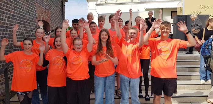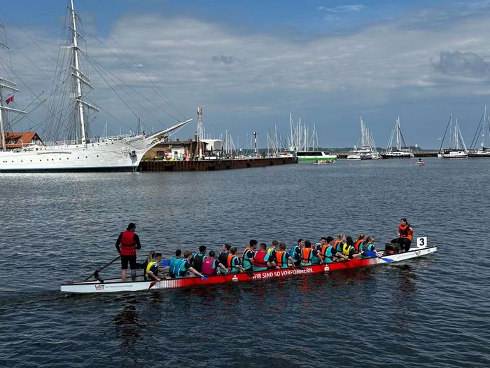 In diesem Jahr stellte das Konfuzius-Institut Stralsund das Drachenbootrennen als eine der zentralen Aktivitäten zum Drachenbootfest in den Mittelpunkt und kooperierte erstmals mit der örtlichen chinesischen Sprachschule Adolf-Diesterweg-Schule. Diese Zusammenarbeit wurde von den lokalen Schulen mit Begeisterung aufgenommen. Rund 450 Schüler aus der Adolf-Diesterweg-Schule sowie sieben anderen Schulen aus Stralsund, insgesamt fast zwanzig Drachenboot-Teams, versammelten sich, um gemeinsam zu konkurrieren. Die Teilnehmer trugen leuchtend bunte Team-Outfits und ruderten im Takt von kräftigen Trommelschlägen mit voller Energie. Sie zeigten einen hohen Teamgeist und eine gute Zusammenarbeit. Das Publikum am Ufer war begeistert und feuerte die Teilnehmer lautstark an, was eine fröhliche und lebhafte Atmosphäre schuf.Im Drachenbootrennen nahm die Adolf-Diesterweg-Schule mit 40 Teilnehmern teil. Die Schüler kamen aus den Jahrgangsstufen 7 bis 10, und die Teams Rollmops“ und Banana“, die mit orangefarbenen bzw. grünen Teamtrikots, die mit Konfuzius-Institut Stralsund“ bedruckt waren, besonders auffielen, zogen die Aufmerksamkeit der Zuschauer auf sich. Ein deutscher Zuschauer äußerte begeistert, dass er nie gedacht hätte, ein so spannendes Drachenbootrennen in Stralsund zu erleben und hoffte, dass künftig mehr solche Veranstaltungen stattfinden würden.