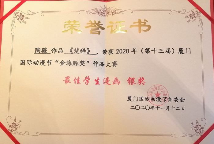11月12日,在第13届厦门国际动漫节“金海豚奖”动漫作品大赛颁奖现场,我校郭慧迪、许琬婷老师指导的动画专业16级陶薇同学的作品《楚辞》,在来自全球43个国家和地区的2916件参赛作品中,以独特的构思和高超的手绘能力,一举拿下最佳学生漫画组银奖,实现了我校动画专业在国内同类赛事奖项的突破。
