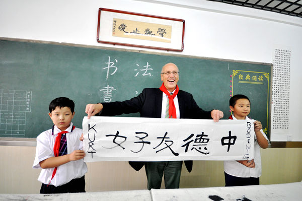 作为“世界可持续交通”的有力推动者,今年,他还赴合肥市阳光中学、凤凰城小学等中小学及交通、物流相关机构和研究所开展交通安全宣传及访问活动,意在宣传交通基础知识,鼓励文明出行方式。博德维希教授对中国的书法也有浓厚的兴趣,他在凤凰城小学开展交通安全知识讲座时,还饶有兴趣的学着学生的样子拿起毛笔书写。同时还虚心地向社团学生请教握笔姿势及书写技巧,并与书法老师合作书写了“中德友好”的字样,他还将此当作礼物送给热情的凤凰城小学的师生们。博德维希教授的合肥之行也受到不少媒体青睐,新浪网、《安徽青年报》媒体认为博等德维希教授此行不仅带来德国的交通安全理念,更深入推进了中德教育合作。