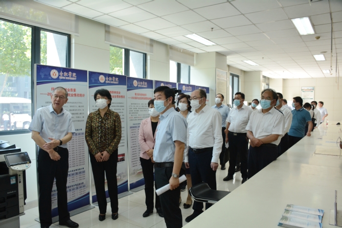 在学生就业服务大厅,翁铁慧一行深入了解学校“访企拓岗”、“访地拓岗”、就业帮扶、就业数据核查等工作开展情况。翁铁慧对学校就业工作取得的成果表示认可,要求进一步加强就业数据核查,深入落实“一生一策”帮扶,推动毕业生更加充分更高质量就业。近年来,学校坚持以学生为中心,打造线上线下学生社区服务平台,努力为学生提供流程简化、便捷高效的服务。现场,翁铁慧肯定了学校“一站式”学生服务平台,希望学校进一步实现管理智能化、服务精准化,赋能大学生思想教育新生态。