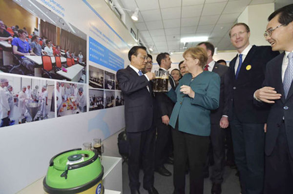 一桶德国啤酒也出现在展览现场。原来,过去该校食品专业的学生只会酿造黄啤,在德国师生的帮助下,后来酿起了黑啤。兴致盎然的李克强和默克尔不由举起酒杯,品尝起中德合酿的美酒。