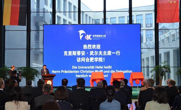 Am 26.05.2018 besuchte Christian Wulff, der ehemalige Bundespräsident sowie Präsident von Global Alliance of SMEs, die Universität Hefei, der sich auch an der Eröffnungszeremonie des German Industry 4.0 (Hefei) Cooperation Promotion Centers, Global Network of Business Organization (Hefei) Bases sowie chinesisch-deutschen Zentrums für Kollaborative Innovation in der Forschung von festen Abfällen, beteiligte. Das Team von Christian Wulff, Vertreter von Global Alliance of SMEs, Vertreter von der Universität Stuttgart, Prof. Dr. Cai Jingmin, Parteisekretär der Universität Hefei sowie Wang Qidong, Vizeparteisekretär sowie Direktor der Universität Hefei nahmen daran teil.